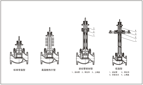 | 系列類型 | 常溫型、中溫型、低溫型。波紋管密封型、夾套保溫型、調(diào)節(jié)切斷型 | ||||||||||||||||||||||