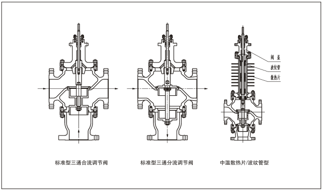 該閥有合(分)流普通型、合(分)流高溫型等多種型式。產品公稱 壓力等級有戶PN1.6、4.0、6.4;閥體公稱通徑范圍DN25~400;泄 漏等級有II級、IV級;流呈特性為直線和等百分比。多種品種規格可供選擇。