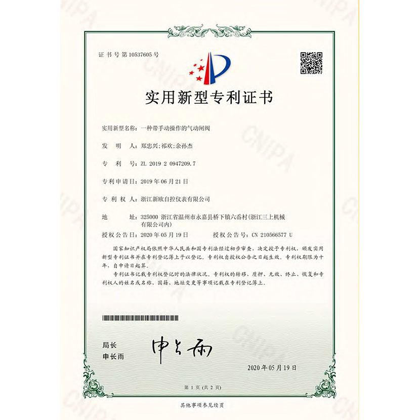一種帶手動操作的氣動閘閥 專利證書